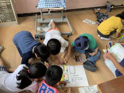 探検で記した地図をもとに、もっとわかりやすい地図を作る方法として地図記号を書いたり、色分けをしたりすることを学びました。