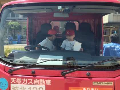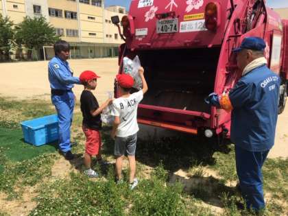 生江小学校にパッカー車がきました。「パッカー車の色が違う理由は?」「パッカー車から流れてくる音楽は何?」などのクイズをしたり、パッカー車にゴミを入れたり、運転席に座らせてもらったりと楽しみながら学習できました。