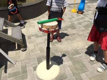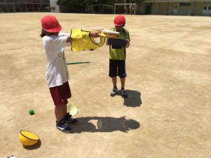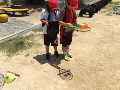 自分たちの体や身の回りにある道具などを、思い思いに組み合わせて、面白い影の形を作り出します。気に入った影の形をタブレットで記録し、教室で発表しました。
