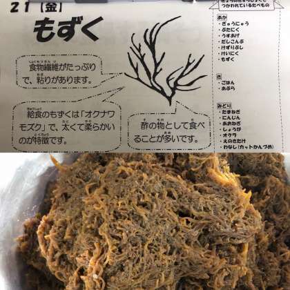 生育期は冬から夏までの一年生海藻である。もずくは、糸状の細い枝が分岐してお互いに絡み合い、ほんだわら、つるもなど大型の海藻に巻きついているため、「藻屑」、「藻つく」などといわれていたため、もずくと呼ばれるようになりました。給食で使用するオキナワモズクは1mm以上で太く、柔らかい食感です。さっと洗って三杯酢や甘酢と和えた酢の物として用いることが多いです。