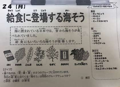 今日の給食では、「ミックス海そう」の献立が登場しました。