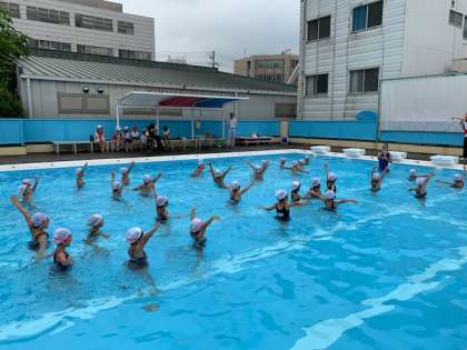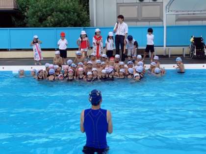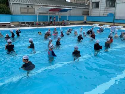 もうすぐ夏本番を迎える前に、着衣泳をしました。いつもは、水着で泳いでますが、今日は服や靴下を履いて泳いでみました。口々に「泳がれへーん」「重たいー」との感想でした。次にペットボトルを使ったり、服に空気を入れて浮く練習をしました。