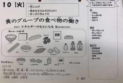 黄のグループの食べ物には炭水化物、脂質が多く含まれ、体の中でエネルギーのもとになる働きがあります。体を動かしたり、脳を働かせたりするためには欠かせないものです。