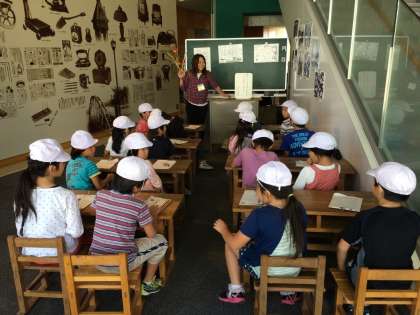 今昔館では、着物を着たり、むかしの大阪の街並みや道具を見たりと子どもたちは珍しそうに見学していました。メモをとる姿もたくさん見られ、楽しみつつも学習もしっかりとしている様子でした。