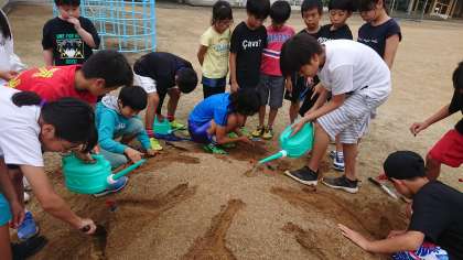 上からじょうろで水を流し、水が流れることで川にどんな変化が表れるのかを観察しました。