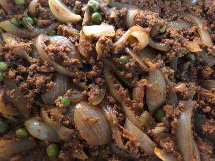1.油を熱し、にんにくを炒め、牛ひき肉、豚ひき肉を炒め、更にたまねぎを炒める。