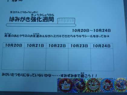 クラス全員がハミガキをしたら、シールがはれます。一人でもしないとはれないので、みんながんばって給食を食べ、ハミガキも熱心にしていました。