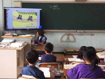 まず、問題の場面を理解させるために、大型ディスプレイで動画を見せました。
