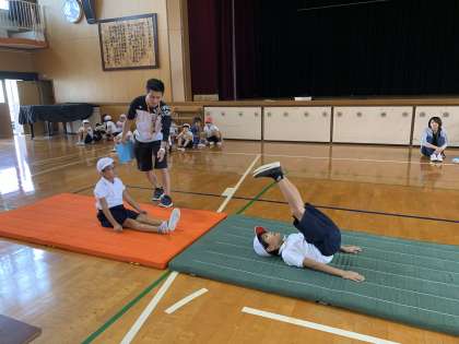 前転に比べると難しく、なかなかきれいに回ることができない様子でした。