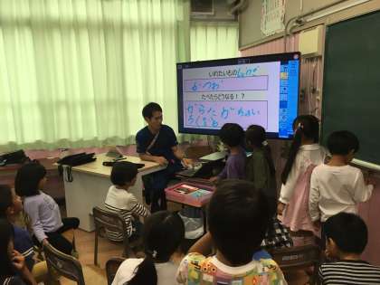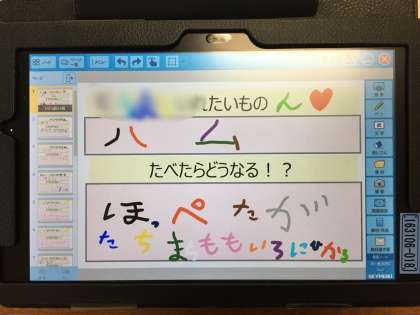 自分の席でタブレットに記入したものが、瞬時に大型ディスプレイに表示されます。