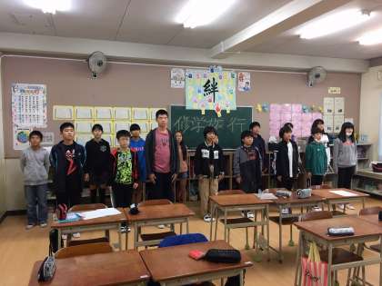 今日は全校集会で、他の学年の子供たちに修学旅行に行ってきますという報告をしました。