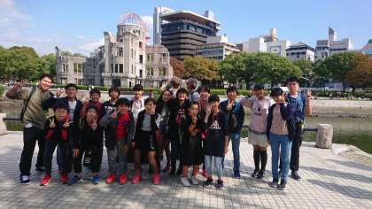 広島での思い出に、原爆ドームをバックにみんなで記念撮影をしました。