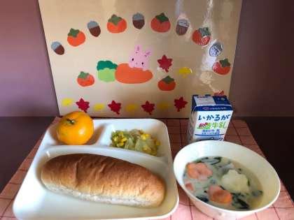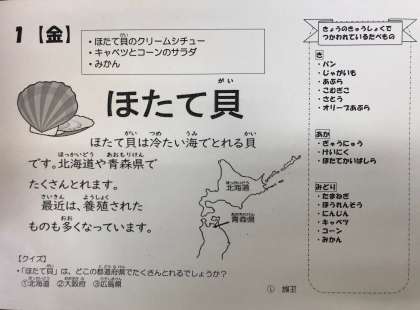 今日は、ほたて貝のクリームシチューに「花型、ハート型」の「ラッキーにんじん、ラッキーじゃがいも」を給食調理員さんが作ってくれ、子どもたちは入っているかワクワクしていました。