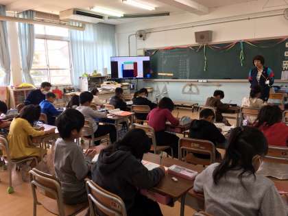 プリントをみんなで読み上げて、答えを考え、書き込んでいきます。