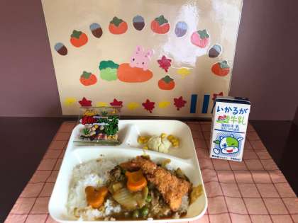 えびフライカレーライスの「にんじん」を「ラッキーミッキー、ラッキープーさん」にしてくれました。