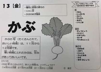 今日は、冬が旬(たくさんとれておいしい時期)の「かぶ」が「かぶのゆず風味」の献立に登場しました。