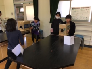 グループでそれぞれ空気砲と的を作り、グループ対抗戦をしました。