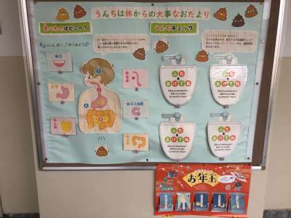 一月の保健掲示板では、お正月元気アップカードと、うんちについてを掲示しています。