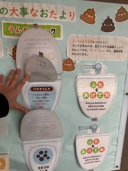 体調が悪くて保健室に来る子どもに「朝、どんなうんちが出た?」と聞くと、出ていない子や、出ていても見ていない子が多いです。うんちを見れば自分の体の状態がわかること、また、食べたものが体の中でどのようにうんちになるかということにも、興味をもってほしいと思い、作りました。