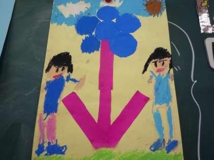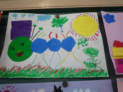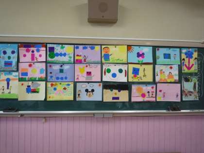 丸や四角を用いて顔を作ったり、組み合わせを考えて電車にしたりと、思い思いのすてきな作品ができました。