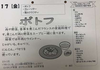 ポトフは、西洋料理の澄んだスープのひとつです。肉類、野菜類、香草を多く使い、煮こんだものです。スープだけでなく、煮こんだ肉・野菜も一緒に食べます。