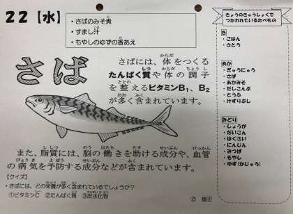 さばには、体をつくるたんぱく質や、炭水化物や脂質がエネルギーになる時に必要な、ビタミンB1、B2が豊富に含まれています。