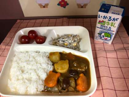 今日は、「豚肉と金時豆のカレーライス」に入っている「にんじん・じゃがいも」を「プーさん型」の「ラッキーにんじん・ラッキーじゃがいも」に給食調理員さんがしてくれました。
