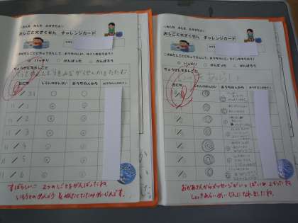 お仕事チャレンジカードを見ていると、前半は△や〇がついていても、後半には◎になっていて、お仕事が上達していることがうかがえました。