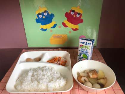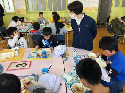 今日は、ランチルームで3年生と5年生で交流給食を行いました。