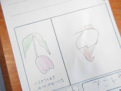 赤・白・黄色・紫・ピンクの5色から何色が咲いてほしいか、チューリップの絵に色をぬりました。