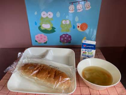 今日から、給食が開始しました。12日までは、「パン・牛乳・大おかず」の給食です。