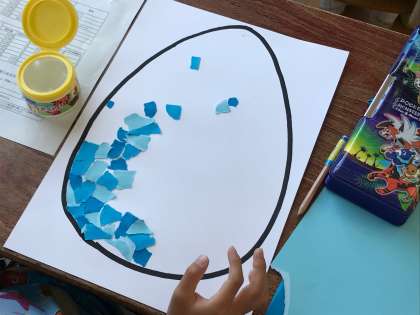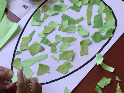3種類の画用紙をいろいろな大きさに千切って、のりでペタペタとはっていきます。