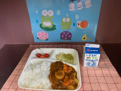 ハヤシライスの中に入っている「にんじん・じゃがいも」を「ミッキー、プーさん」の形の「ラッキーにんじん、ラッキーじゃがいも」に給食調理員さんがしてくれました。子どもたちに伝えると「入っているかな?」と楽しみにしていました。