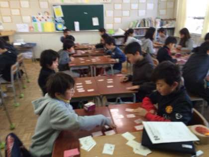 教室で行っているのは、1対1で20枚を取り合う、五色百人一首です。