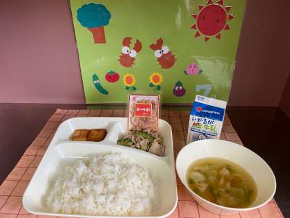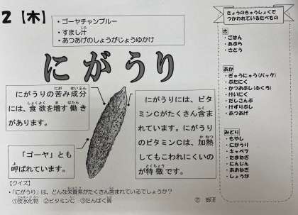 今日の給食では、「ゴーヤチャンプルー」の献立に登場しました。