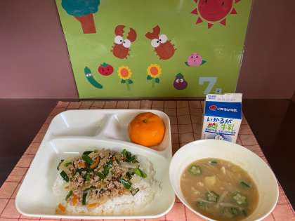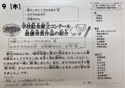 献立のねらいは、「疲労回復と夏ばて防止をメインとした夏の献立としてビタミンB1を多く含む豚肉と、その働きを促進し糖質を素早くエネルギーに変えるにら、にんにく、たまねぎを一緒に調理しました。また、オクラのみそ汁で整腸作用、さらにみかんのクエン酸効果によるさっぱり感と疲労回復、夏ばて防止を考えました。」とのことでした。