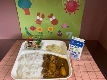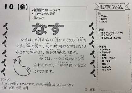 今日の給食献立の、「夏野菜のカレーライス」に「なす」が入っていました。