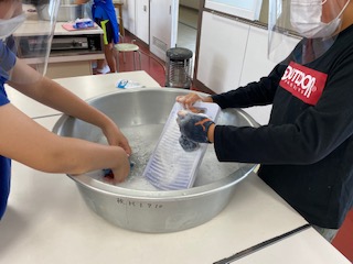 今日は、家庭科の学習でくつ下の洗たくをしました。