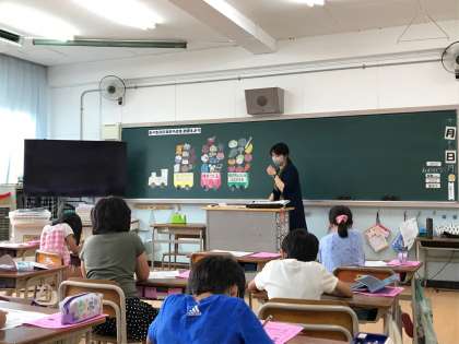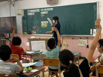 今日は、2時間目に2年生で「たべもののはたらきをおぼえよう」、6時間目に4年生で「野菜について知ろう」の栄養指導を行いました。