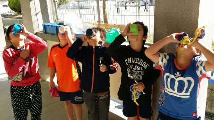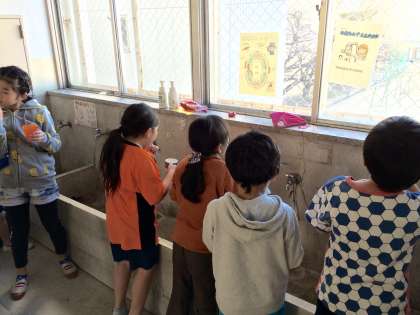 そして、今日の昼休みに歯の染め出しをしました。給食後の手洗い場では、