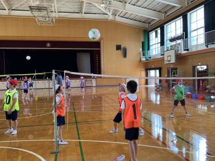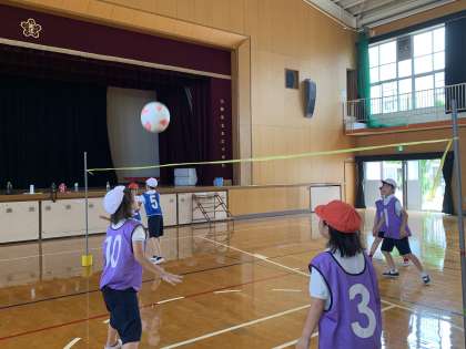 一見バレーボールのように見えますが、レシーブなどはなく、ボールはキャッチ、キャッチしたらパスを回してアタックする!という、だれもが楽しめるネット型ゲームです。