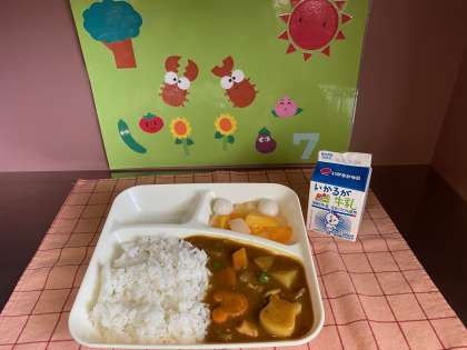 今日は、チキンカレーライスに「ミッキー型・プーさん型」の「ラッキーにんじん、ラッキーじゃがいも」を給食調理員さんが作ってくれました。