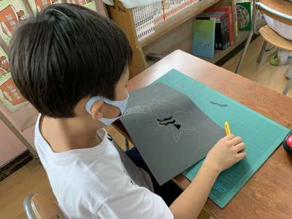 魚、鳥、蝶、カタツムリ、亀などの題材から自分が描きたいものを選び、三角や四角、丸や三日月、波線などの模様を描きます。その模様をカッターナイフを使って切り抜き、切り抜いたところに色をつけるとステンドグラス風な作品の出来上がり〜!!