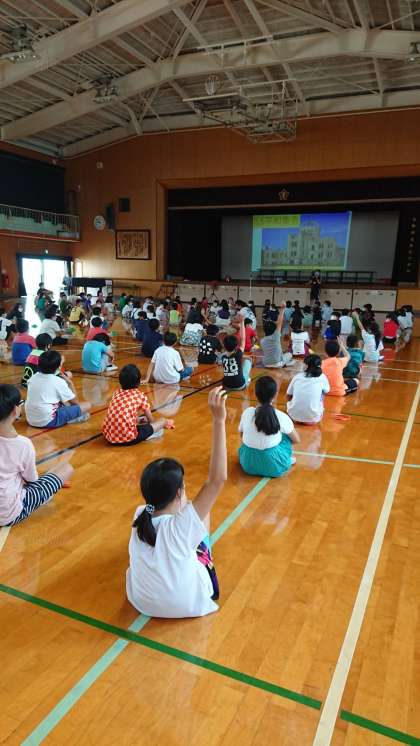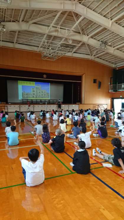 前半は、講堂で、子どもたちが、距離をとりながら、静かに話を聞いていました。また、平和について考えながら、真剣に聞くことができていました。