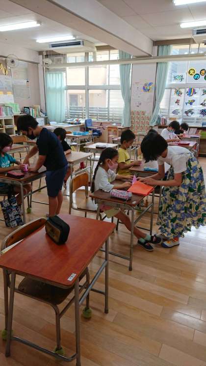 後半は、縦割り班に分かれ、6年生を中心に折り鶴の折り方を教え合う活動をしました。6年生は、優しく下級生に教えていました。みんな平和を願う気持ちをもって、丁寧に折っていました。千羽鶴が完成するのが楽しみです。