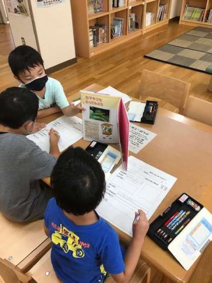 せいかつかの学習で、いきものを飼うための計画を立てています。図書室で情報を集めるために、図鑑などで飼い方やいきものの習性などを調べています。みんなとても真剣に、そして楽しそうに学習をすることができました。さて、まずはそのいきものをつかまえにいかなければ…カナヘビやカエルなどもいて、なかなか難しそうです。