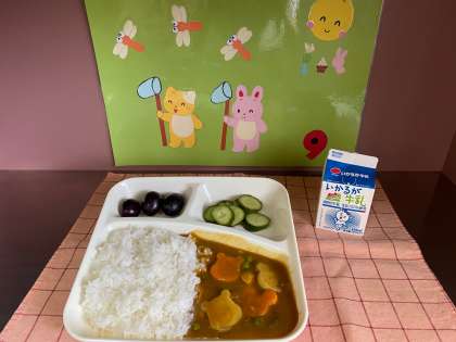 今日は、チキンカレーライスの中に「ミッキーとプーさん型」の「ラッキーにんじん・ラッキーじゃがいも」を給食調理員んさんが作ってくれました。