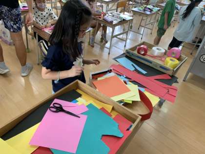 今日の図画工作科では、画用紙を使って、頭にかぶれる「わ」をつくりました。
