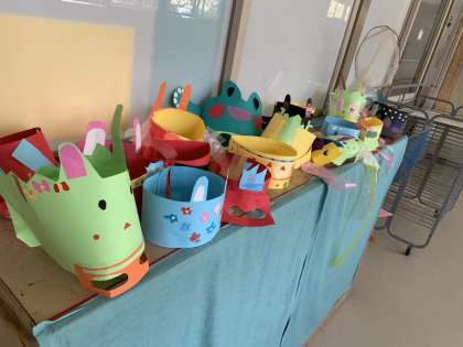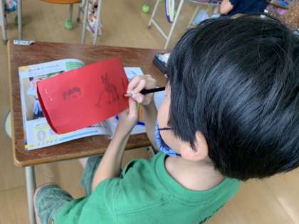 わの周りに、たくさん花や自分のお気に入りの絵をかいたり、めがねをとりつけてみたり、自分たちで考えて、作品づくりに集中していました。