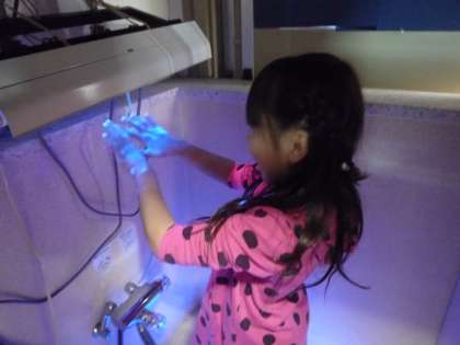 きちんと洗えているかを確かめるために、ブラックライトで手を見ると・・・